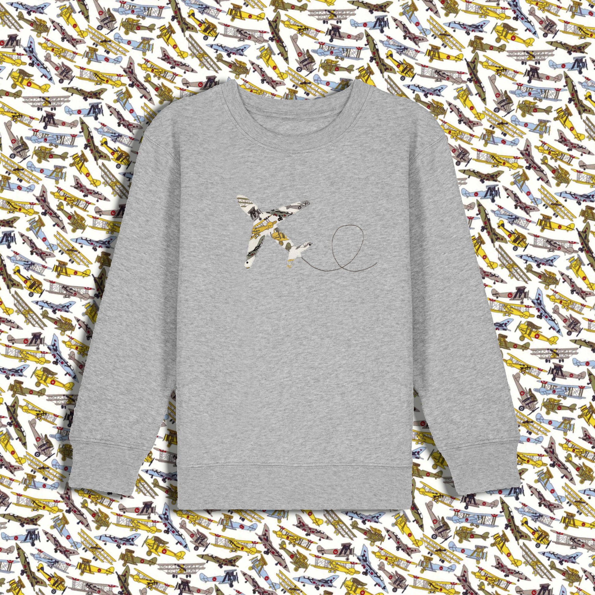 Each sweatshirt is hand-finished with a playful plane appliqué crafted from Liberty Tana Lawn cotton fabric and a complementing stitch detail.