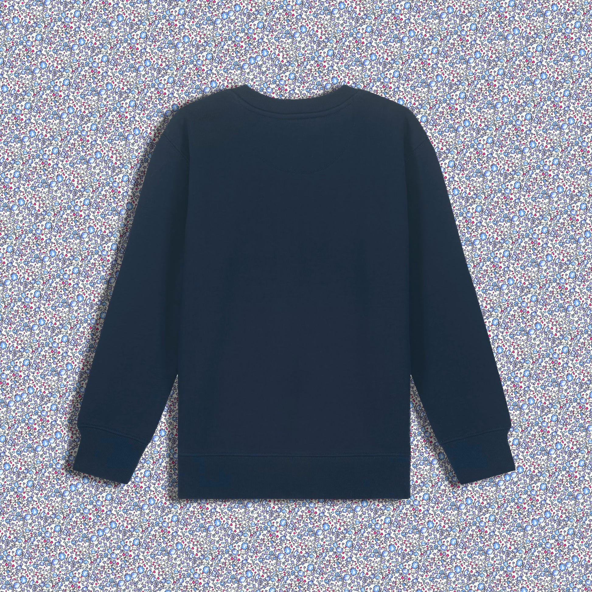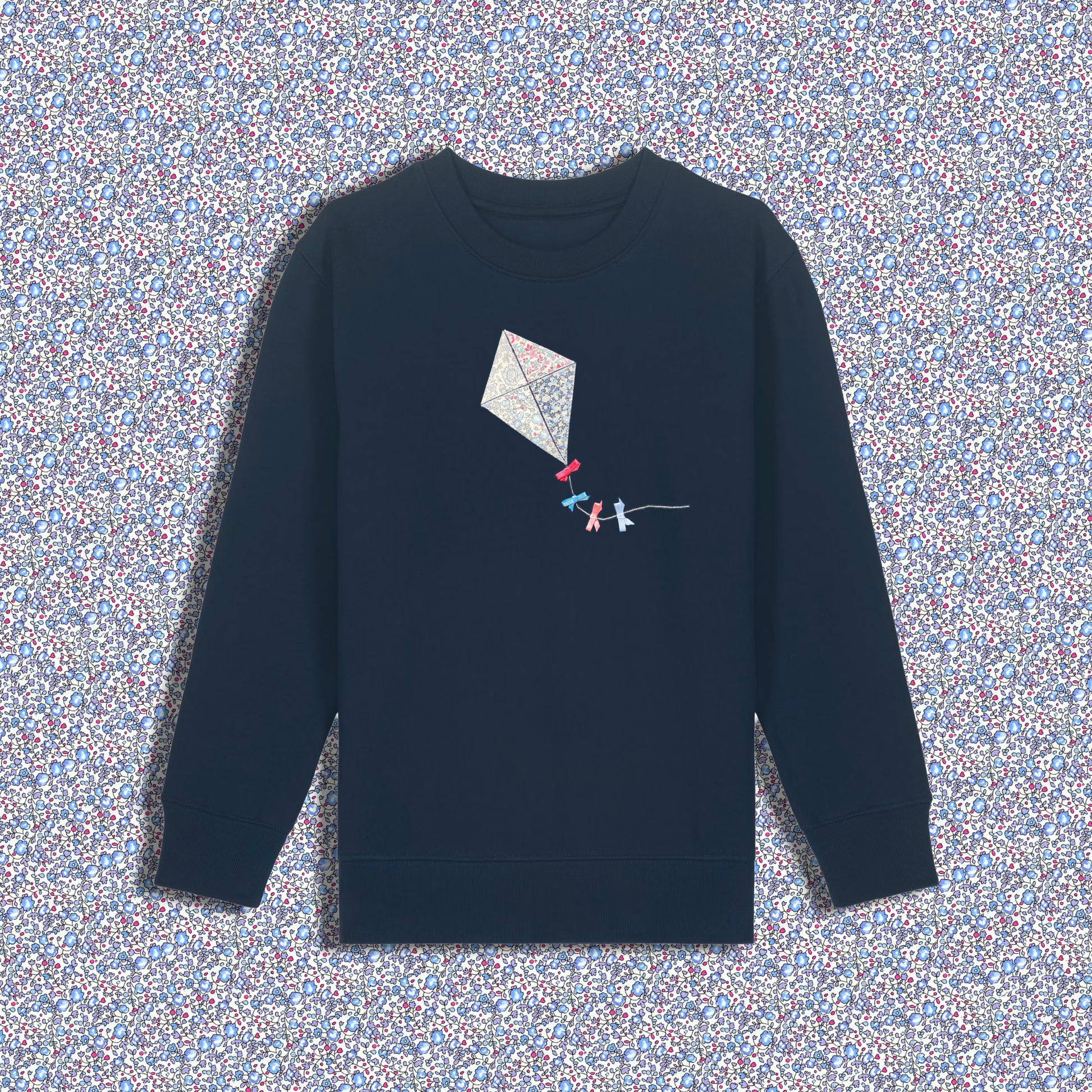 Each sweatshirt is hand-finished with a playful kite appliqué crafted from Liberty Tana Lawn cotton fabric and a complementing tail with satin bows.