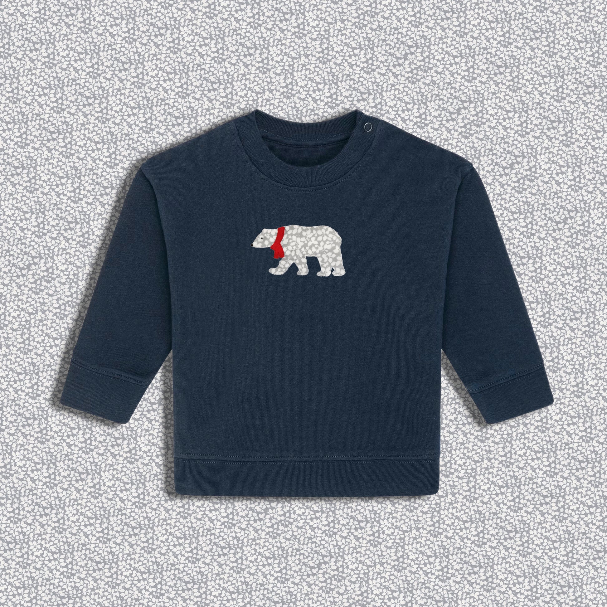 Each sweatshirt is hand-finished with a playful polar bear appliqué crafted from Liberty Tana Lawn cotton fabric.