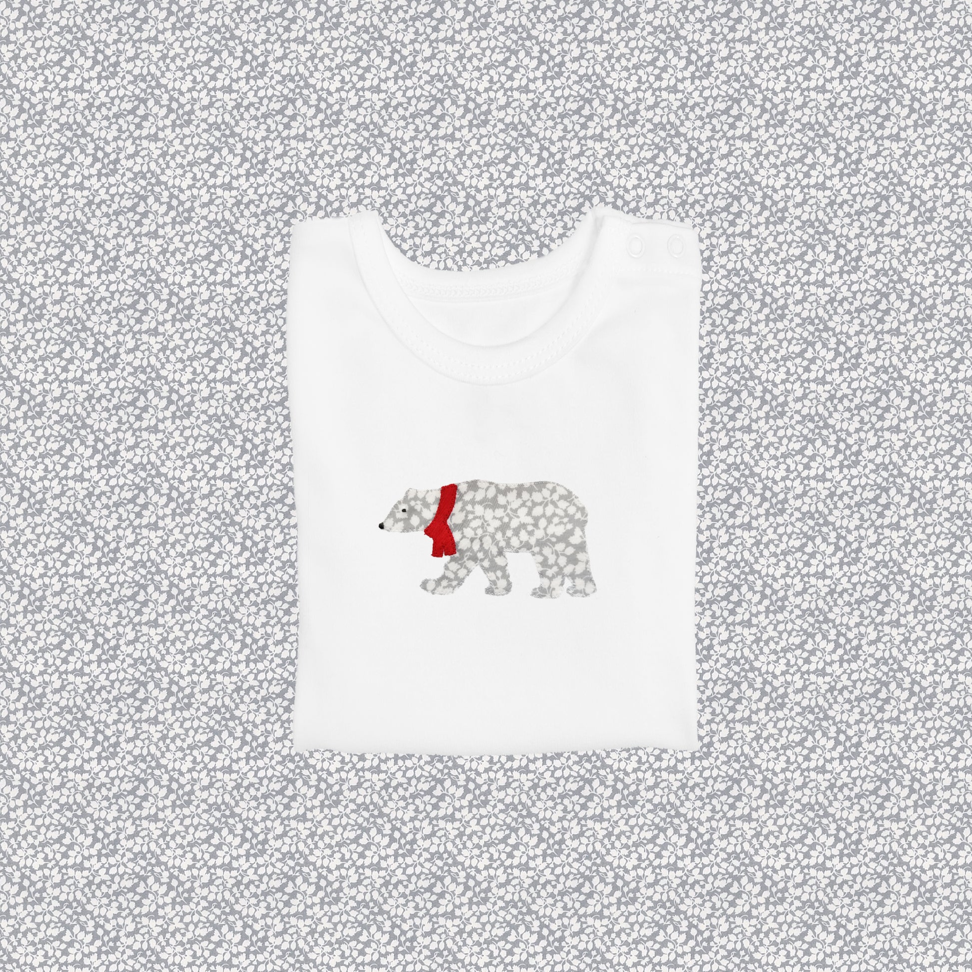 Featuring a charming polar bear appliqué made from Liberty fabric and complementing red scarf , each T-shirt is a delightful and cute addition to any outfit.